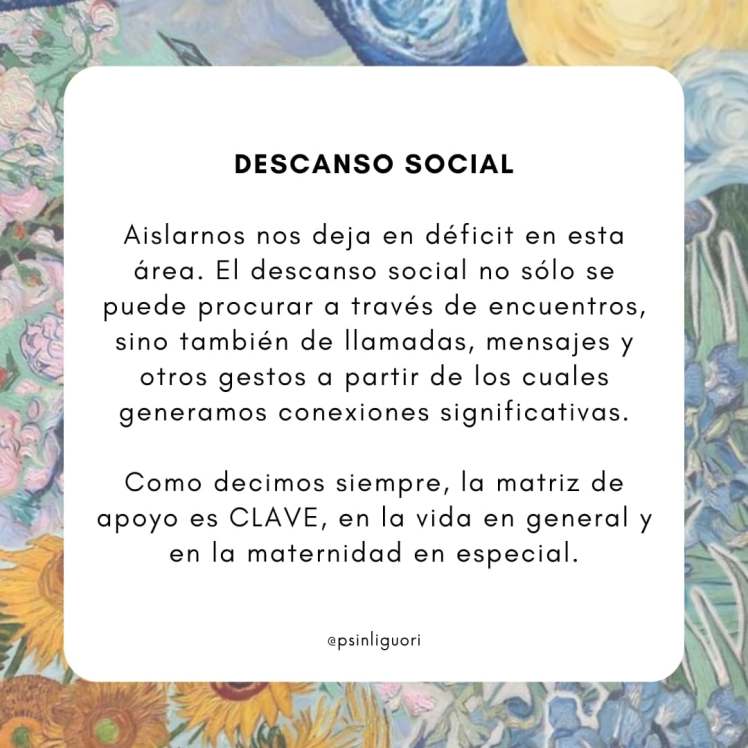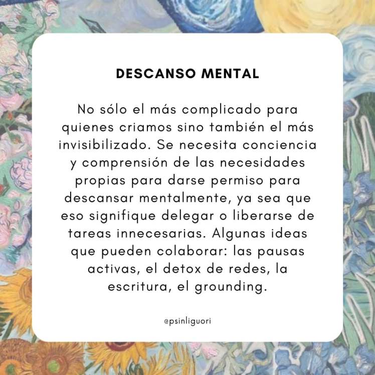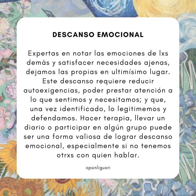 Cuando hablamos de descansar -fuera del sueño-, pensamos inmediatamente en actividades estereotipadas de «autocuidado», como irnos de spa, recibir un masaje y cosas así que, para muchas, se vuelve algo más en la lista de pendientes… cansándose el doble al tener que pensar en gestionar el cuidado infantil, en el trabajo que queda postergado, etc ![]()