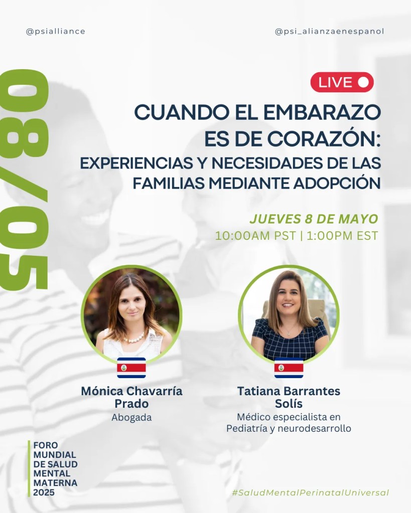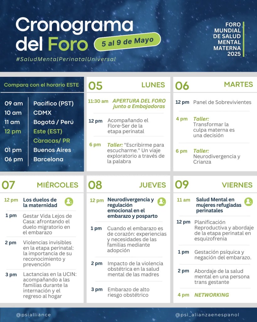 Del 5 al 9 de mayo de 2025, únete al Foro Mundial de Salud Mental Materna: un evento global y gratuito con ponencias, talleres y espacios de networking para profesionales y familias hispanohablantes.