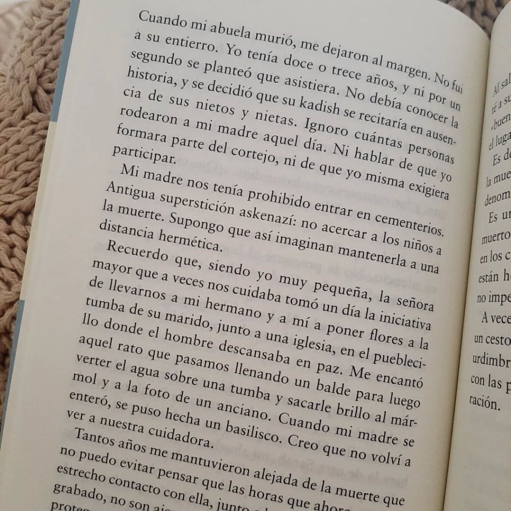 Hermoso hermoso libro; «tratado de consuelo que se teje con tres hilos: la evocación de la vida interrumpida, la interpretación de los textos sagrados y las tradiciones funerarias y la rememoración de ciertos episodios de la vida de la autora, con los que construye un relato que entrelaza a los vivos y a los muertos».
